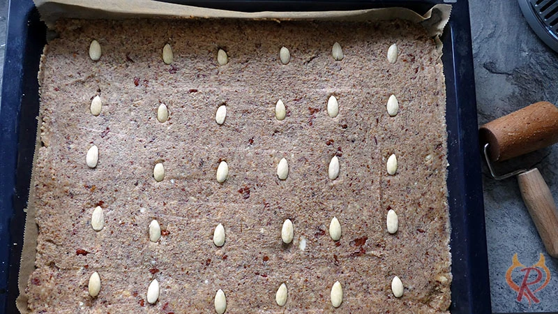 - Ein Backblech mit Backpapier auslegen und den schweren und festen Teig darauf gleichmäßig flach mithilfe eines nassen Löffels streichen oder z. B. mit einer konischen Teigrolle ausrollen. Die gehäuteten Mandeln in gleichmäßigem Abstand auf den Teig legen und leicht andrücken.