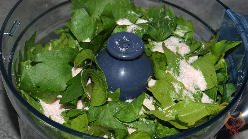- Liebstöckelblätter und Salz bereit zum Mixen