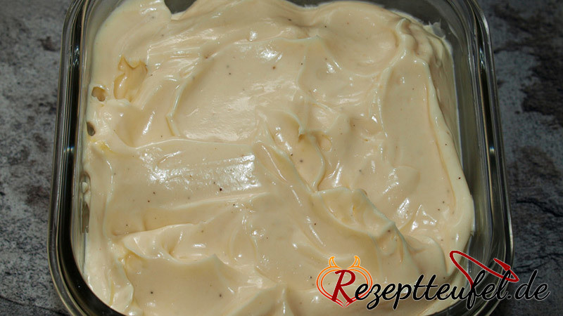 - Alle Zutaten in ein hohes, schlankes Gefäß geben. Dabei darauf achten, dass zuerst das Ei in das Gefäß gegeben wird!Den Zauberstab (mit der Lochscheibe versehen) auf den Boden des Gefäßes stellen und einschalten. Solange auf dem Boden belassen, bis sich die vermengte Masse im unteren Bereich verdickt. Jetzt den Zauberstab langsam nach oben ziehen, bis das Öl ganz untergerührt ist.1 Ei, 10 g Senf, 0.5 TL Salz, 0.5 TL Zucker, schwarzer Pfeffer, 1 EL Zitronensaft, 250 ml Öl