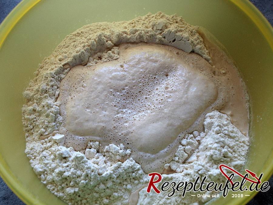 - Der Teig ist zunächst sehr steif, wird jedoch durch längeres Kneten weicher und elastischer. Die richtige Konsistenz erhält der Teig nachdem er gegangen ist.