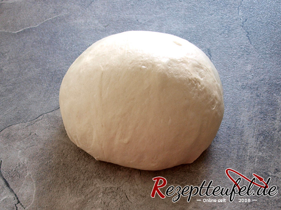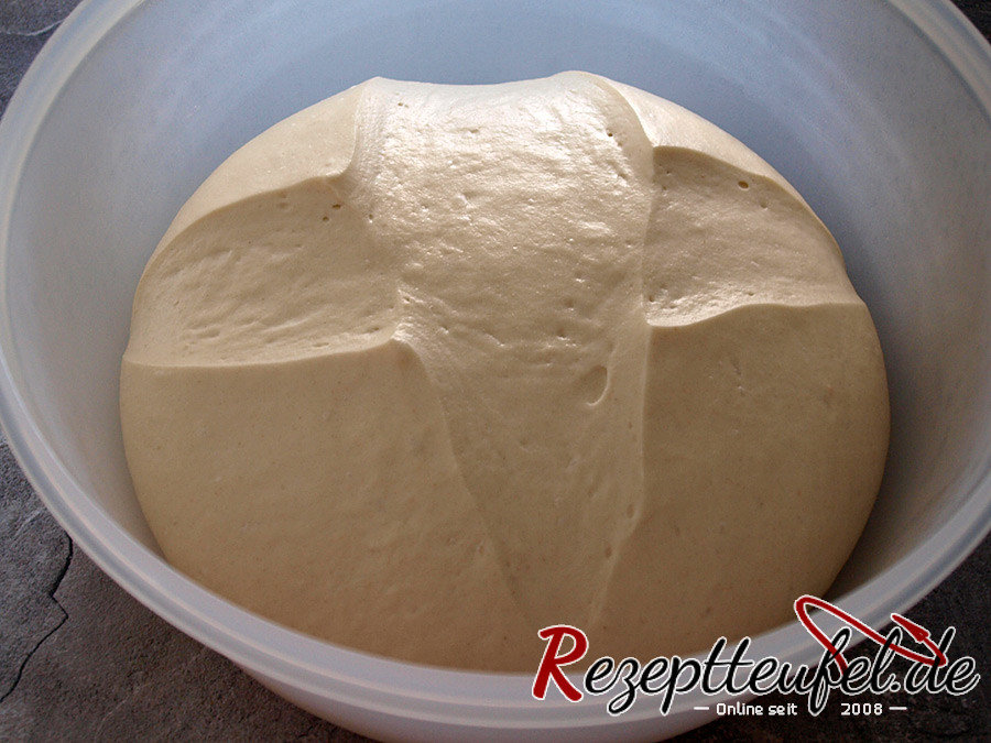 - Den Teig in eine Schüssel geben, abdecken und ca. 1,5 Stunden gehen lassen bis er sich verdoppelt hat.