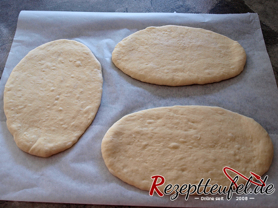 - Die Teigfladen nun mit dem Backpapier auf das heiße Blech geben und ca. 12-15 Minuten backen. Mit den anderen Teigfladen ebenso verfahren wie mit dem ersten Blech. Die gebackenen Pitta direkt nach dem Backen in Tücher wickeln damit sie weich bleiben.
