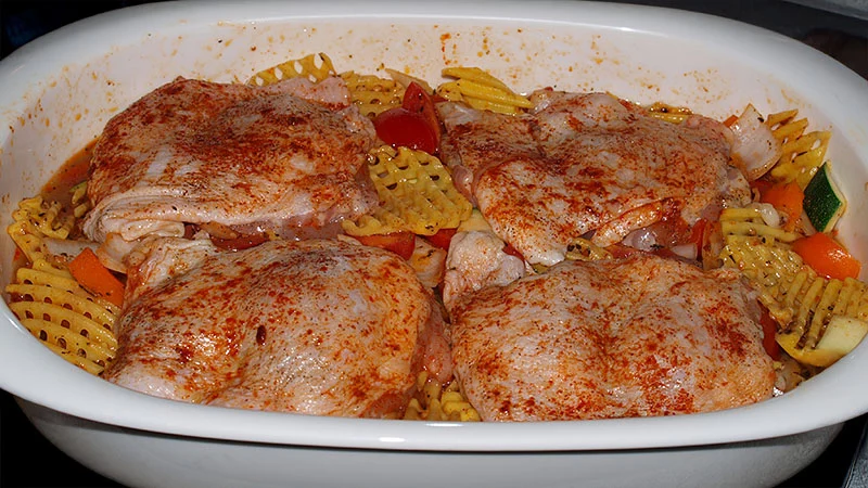 Pollo Fino auf buntem Ofengemüse lässt sich perfekt vorbereiten. Die komplette Mahlzeit mit Gemüse, Kartoffeln und Fleisch wird in einer Auflaufform im Backofen gegart.