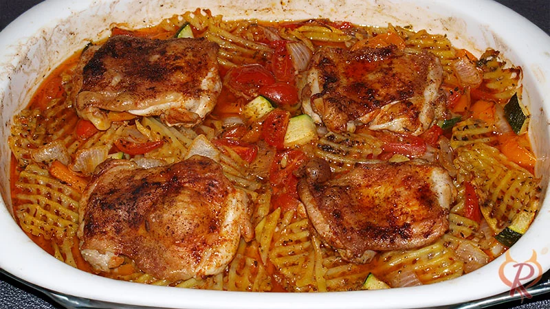 - Pollo Fino auf buntem Ofengemüse, frisch aus dem Ofen