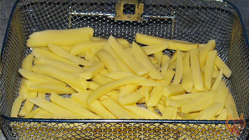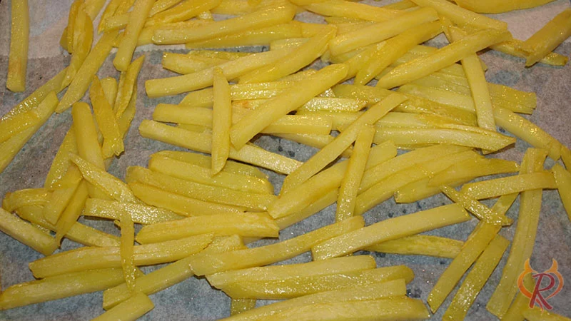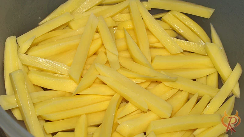- Nach dem Schneiden werden die Kartoffelstäbchen gewaschen (damit überschüssige Kartoffelstärke entfernt wird), auf ein Geschirrtuch gegeben und gut abgetrocknet.