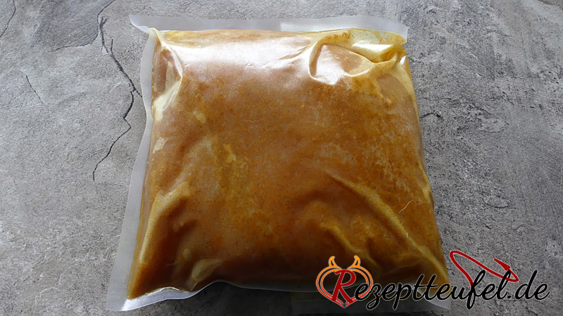 oder den Vakuumbeutel zuschweißen.Den Beutel mit möglichst wenig Lufteinschluss verschließen (mit einem Clip oder den Vakuumbeutel zuschweißen).Den Beutel in den Kühlschrank geben und je cm Fleischdicke 1 Tag +/- 1 Tag durchziehen lassen.