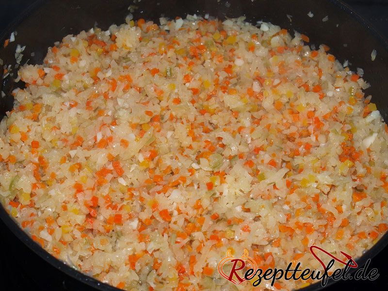 - Die Knoblauchzehen schälen und in feine Würfel schneiden. Die Zwiebeln, Möhren und den Sellerie putzen bzw. schälen und ebenfalls in sehr feine Würfel schneiden.
