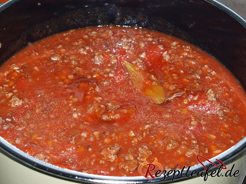 - Das gebratene Fleisch in einen großen Topf geben. Das vorbereitete Gemüse zum Fleisch hinzufügen und mit 750 ml Brühe ablöschen. Die Tomaten, etwas Salz, Pfeffer und die Lorbeerblätter hinzufügen. Den Deckel auf den Topf geben und die Bolognese mindestens 2 Stunden köcheln lassen, dabei zwischendurch umrühren. Sollte die Bolognese zu fest werden noch die restliche Brühe hinzufügen.