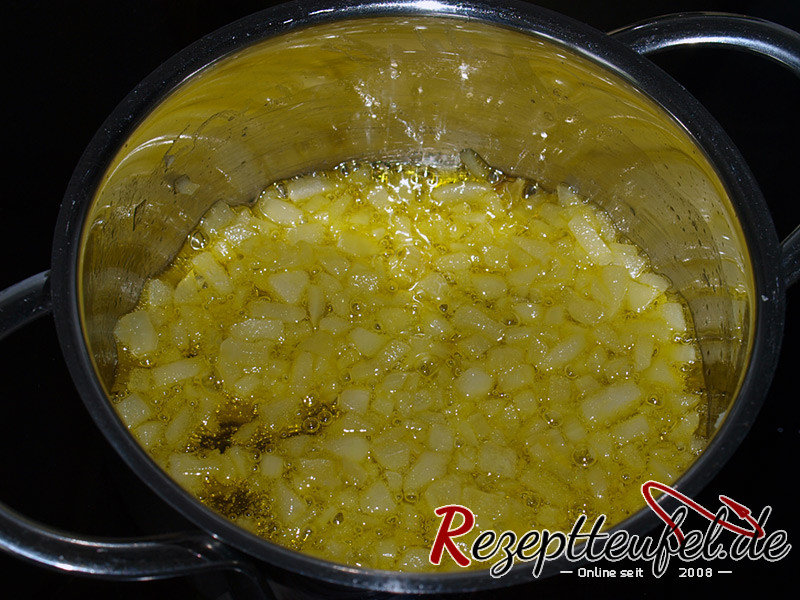 - Während die Kartoffeln kochen die Zwiebel schälen, in feine Würfel schneiden und mit dem Öl in eine Pfanne oder einen Topf geben, andünsten bis die Zwiebeln glasig sind.