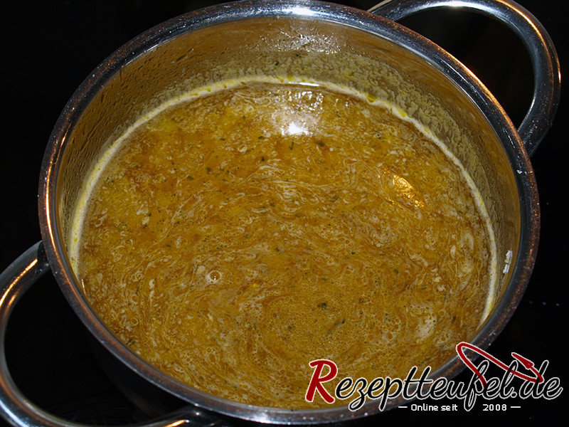 - Die Brühe mit den Gewürzen zu den Zwiebeln geben