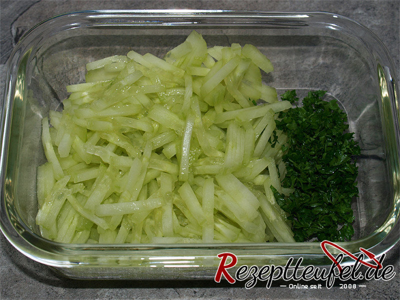 - Inzwischen die Schlangengurke schälen und in feine Streifen hobeln. Petersilie unter Wasser abwaschen und fein schneiden.