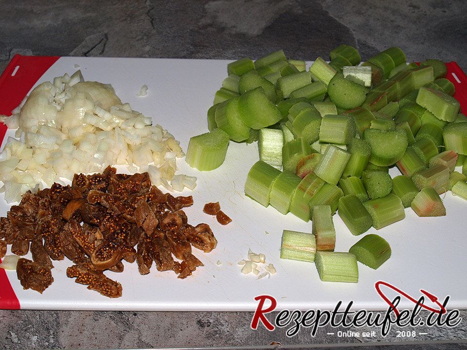 - Den Rhabarber schälen und in ca. 1 cm lange Stücke schneiden. Die Zwiebeln und den Knoblauch schälen und würfeln. Die Feigen in Stücke schneiden.500 g Rhabarber, 100 g Zwiebel, 200 g getrocknete Feigen, 1 Zehe(n) Knoblauch