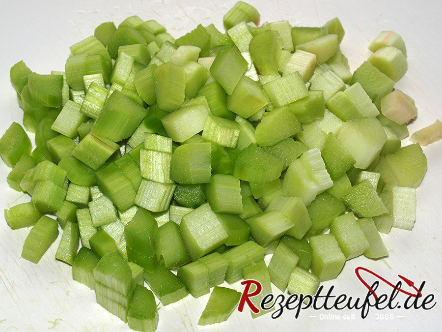 - Die Schale vom Rhabarber abziehen und die Rhabarberstangen in kleine Stücke schneiden