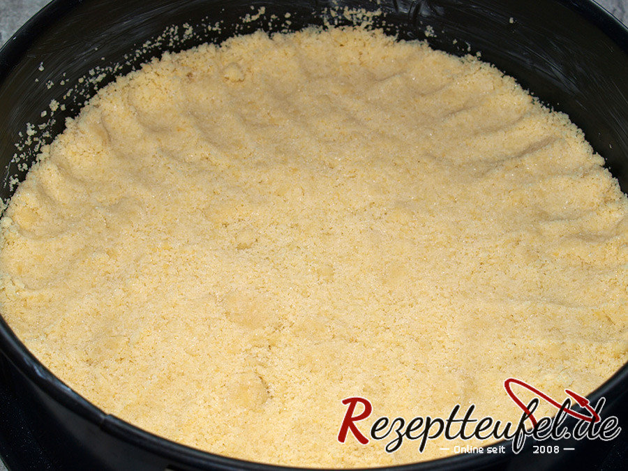 - Die Springform einfetten, die Hälfte des Teiges auf den Springformboden geben und mit der Hand leicht andrücken.