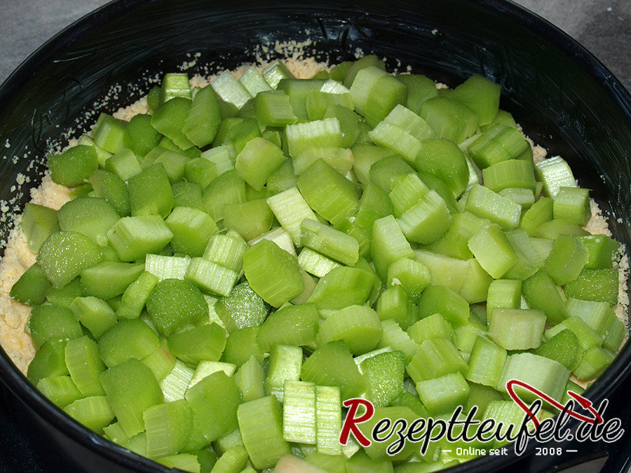 - Den Rhabarber auf den Streuselboden geben, dabei einen kleinen Rand freilassen.