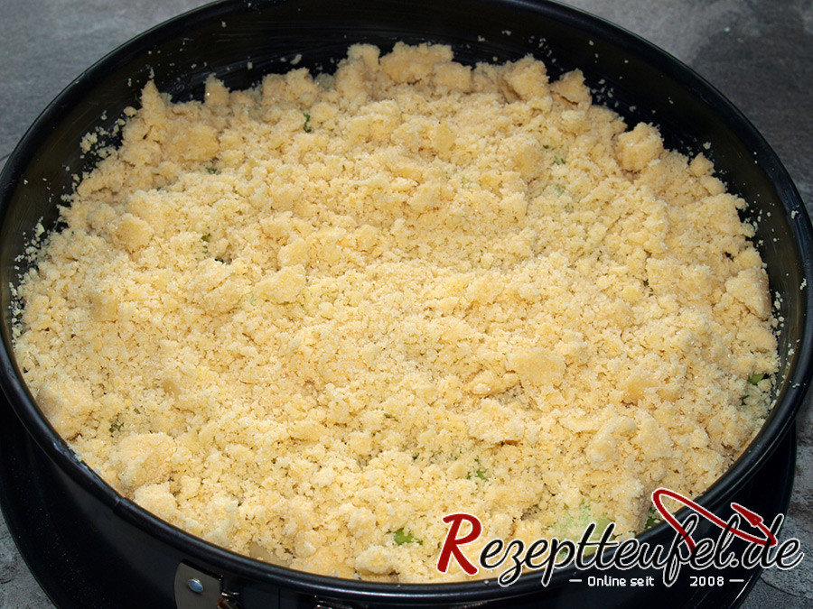 - Über die Füllung den Rest der Streusel verteilen, dabei darauf achten, dass reichlich Streusel an den Rand gelangen.