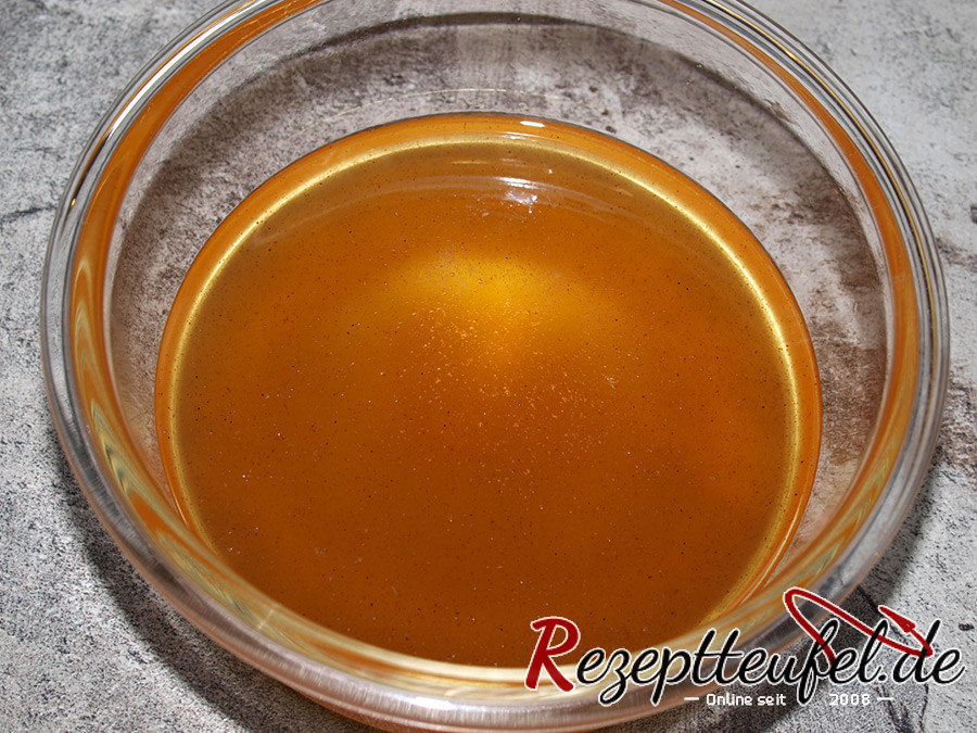 - Die Flüssigkeit in saubere, heiß ausgespülte Einmachgläser mit Schraubdeckel geben, sofort verschließen.