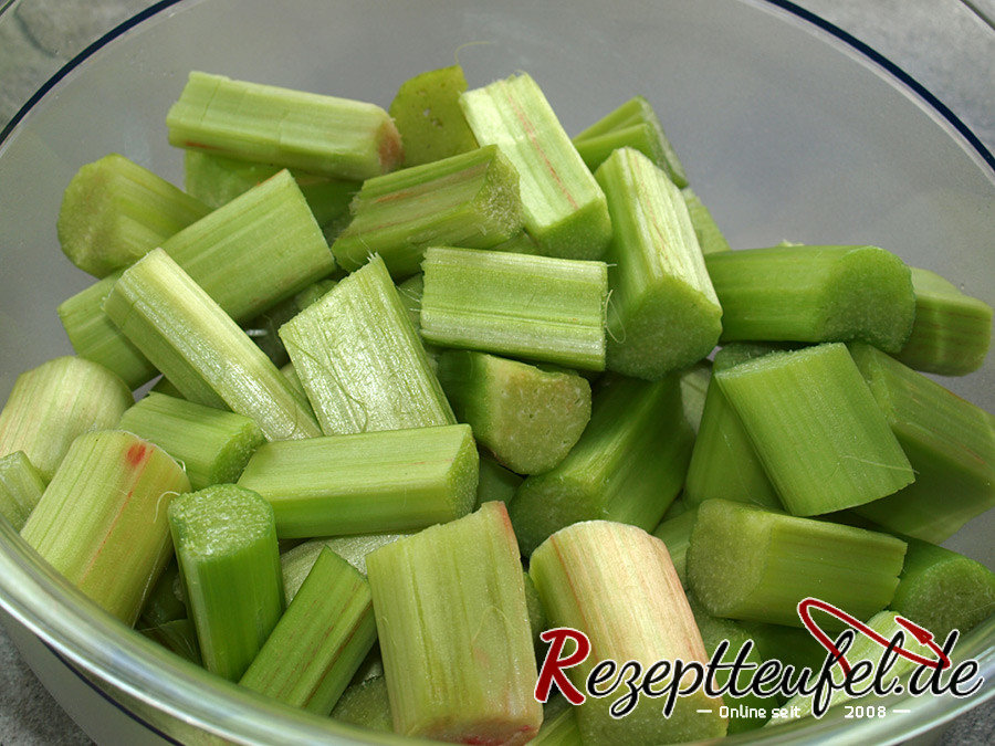 - Den Rhabarber schälen (die Haut abziehen) und die Stangen in Stücke von ca. 5 cm schneiden.
