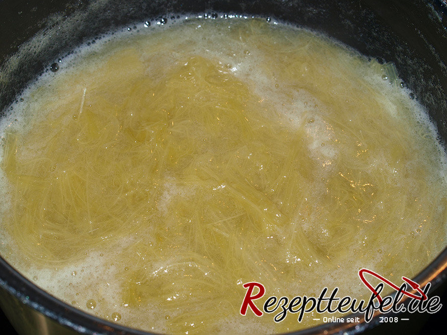 - Das Wasser mit dem Rhabarber in einen Topf geben, den Topfinhalt aufkochen und ca. 20 Minuten köcheln lassen bis der Rhabarber zerfällt.