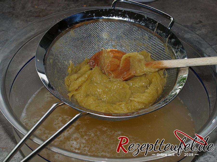 - Jetzt werden die Rhabarberfasern vom Saft getrennt. Dazu den Topfinhalt in ein feines Sieb geben und den Saft des Rhabarbers dabei in einer Schüssel auffangen. Die Rhabarberfasern im Sieb gut ausdrücken.
