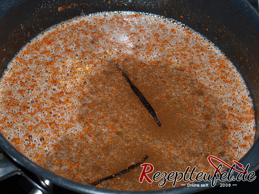 - Der Rhabarbersaft mit den Gewürzen und dem Zucker