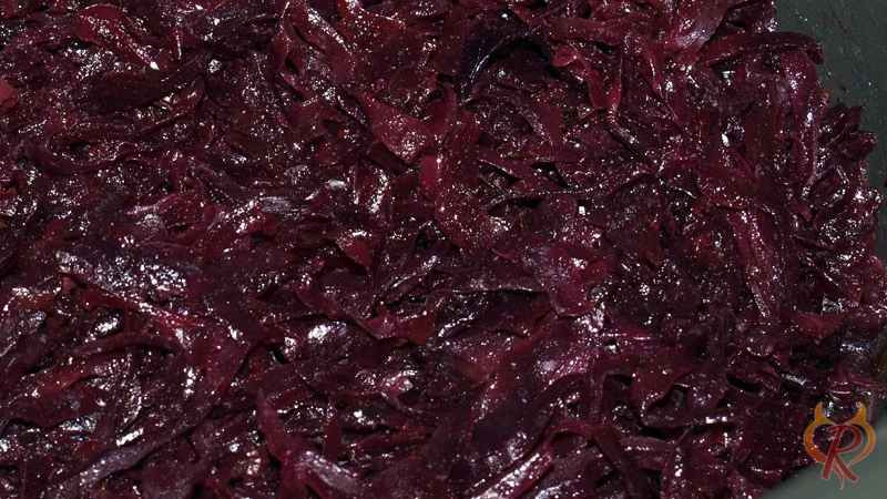 Man kommt jedoch nicht ganz ohne Herd zu diesem wohlschmeckenden rotem Kohl, denn sowohl die Zwiebelschmelze als auch der reduzierte Portwein müssen in einer Pfanne zubereitet werden.