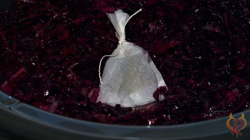 - Alle Zutaten in einen Topf geben und vermengen. Das Gewürzsäckchen hinzufügen und mit Rotkohl bedecken. Ca. 1–3 Stunden (je nach Menge) köcheln lassen, bis der gewünschte Gargrad erreicht ist. Zwischendurch umrühren nicht vergessen.
