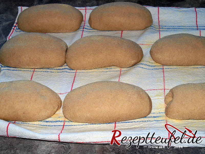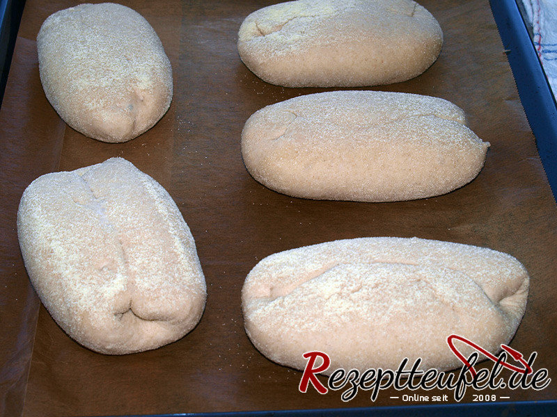 - Die Teiglinge mit dem Schluss nach oben auf ein Backpapier oder direkt auf den Backstein legen
