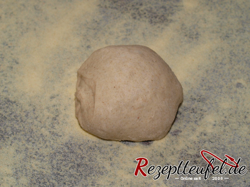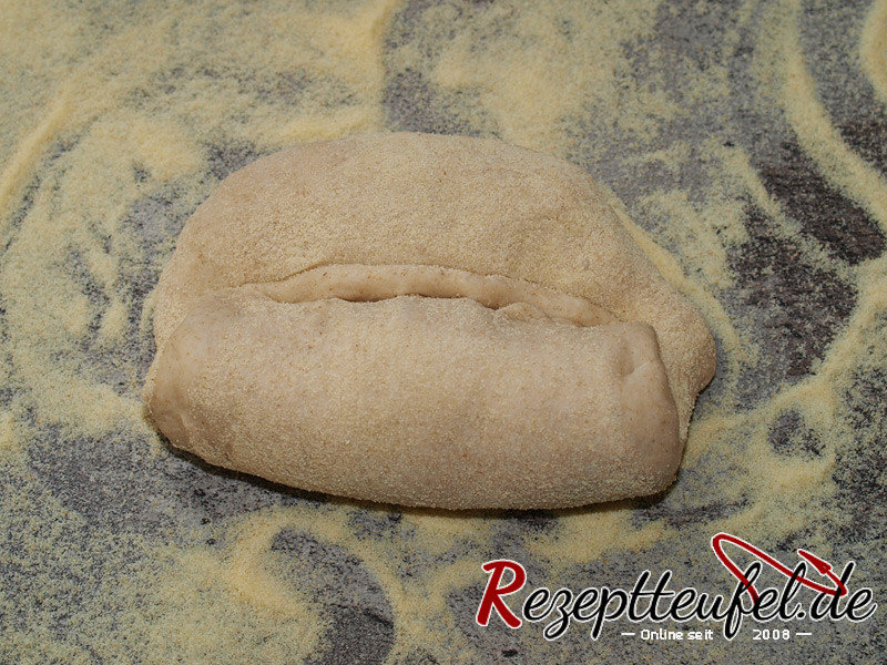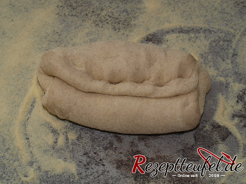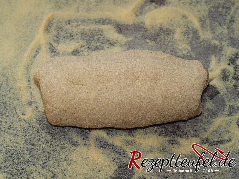 - Den Teigling umdrehen (Schluss nach unten) und etwas langgrollen