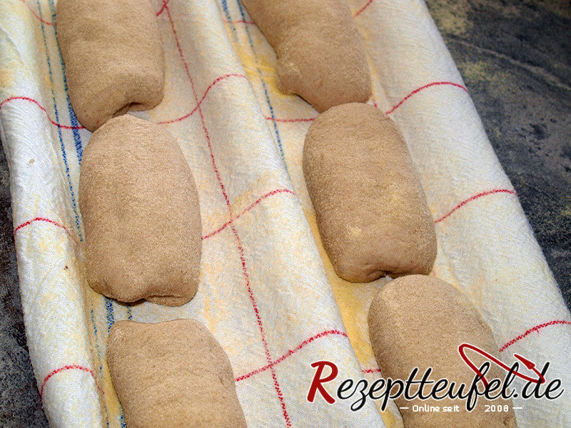 - Die Teiglinge auf ein Bäckerleinen oder mit Roggenmehl bestreutes Geschirrtuch einschlagen und ca. 60 Minuten gehen lassen, bis sie sich das Volumen verdoppelt hat.