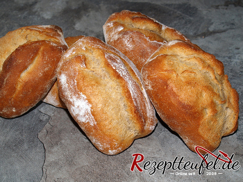 Große, rustikale Brötchen mit knuspriger Kruste, unregelmäßiger Porung. Mit Vorteig und Übernachtgare.