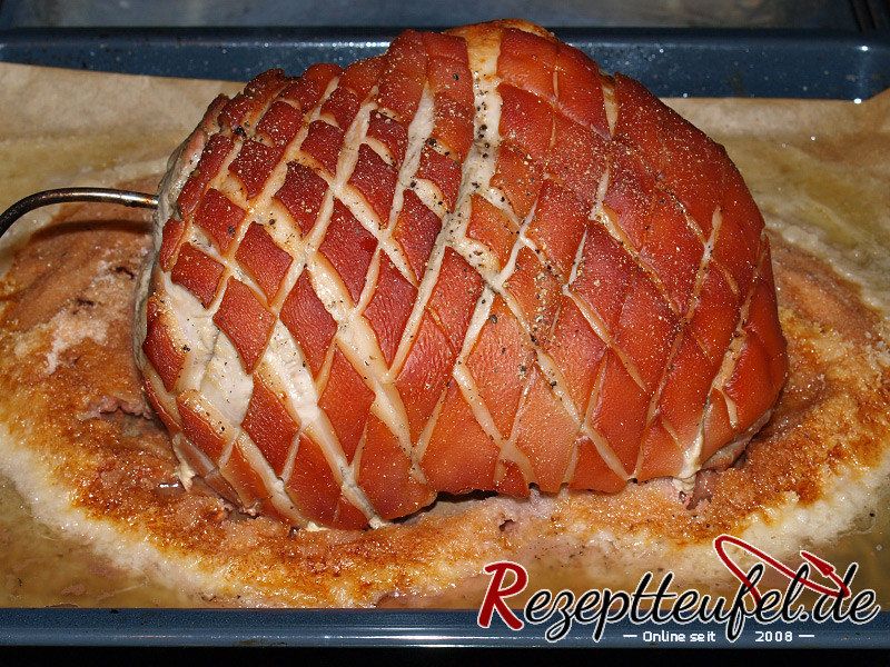 - Ein Backblech mit Backpapier belegen. Darauf das Salz geben und in der Größe der Spanferkelschulter anhäufen.Das Fleisch unter Wasser abwaschen, trocken tupfen und die Schwarte mit einem sehr scharfen Messer oder einer Rasierklinge rautenförmig einschneiden. Die Schulter in Form schieben (rundlich zusammendrücken), auf das Salz legen und den Braten mit groben, frisch gemahlenem Pfeffer bestreuen. Falls ein Kerntemperatur-Thermometer verwendet wird, wird dieses in die Seite des Bratens reingeschoben.2,5 kg Spanferkelschulter, 1,3 kg Salz, schwarzer Pfeffer