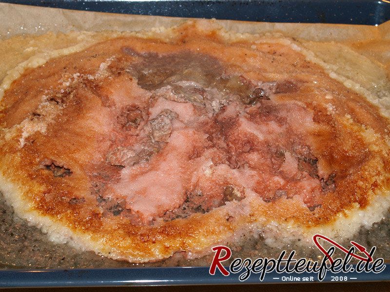 - Das Salzbett zeigt sich nach dem Garen als verkrusteter Klumpen