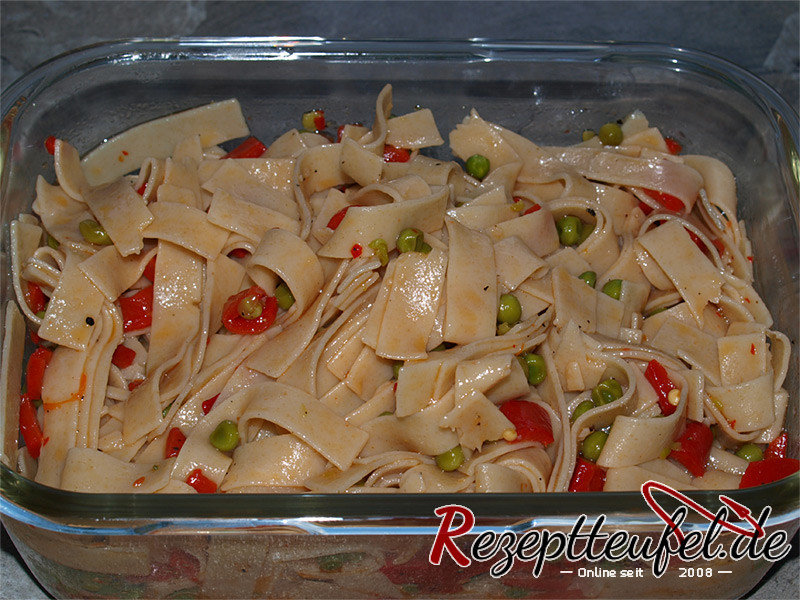- Nudeln, Paprika und Erbsen in das Dressing geben, vermengen und 30 Minuten ziehen lassen.