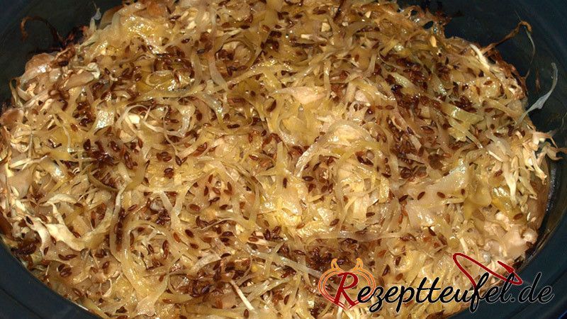- Die Hälfte des vorgebrühten Spitzkohls in den Keramiktopf eines Slow Cooker geben.Darauf zuerst die Hälfte der Kartoffeln schichten, mit Salz und Pfeffer würzen, dann die Hälfte der Zwiebelringe.Die Bratwurst zerrupfen und als nächste Schicht darauf geben.Jetzt die restlichen Zwiebelringe, dann die Kartoffelscheiben und zum Schluss den restlichen Spitzkohl schichten.Nochmals mit Salz und Pfeffer würzen, den Kümmel auf dem Kohl verteilen, die Brühe angießen und die Butter in Flöckchen oder dünnen Scheiben auflegen.Salz, schwarzer Pfeffer, 1 TL Kümmel, 40 g Butter, 200 ml Brühe