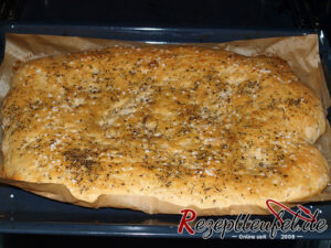 - Ein Backblech mit Backpapier auslegen, darauf den Teig geben und mithilfe eines nassen Löffels auf dem Backpapier verstreichen bis 2/3 des Blechs bedeckt ist. Das Öl auf dem Teigfladen verteilen, mit Salz und den Kräutern bestreuen.