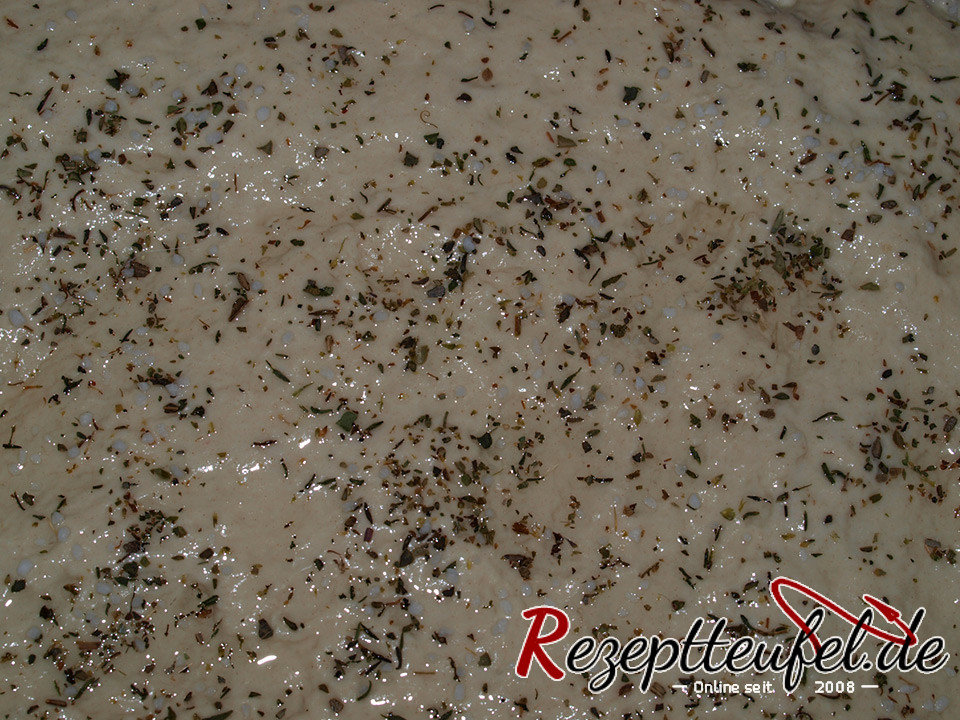 - Der Teig mit Öl, Salz, Thymian und Oregano