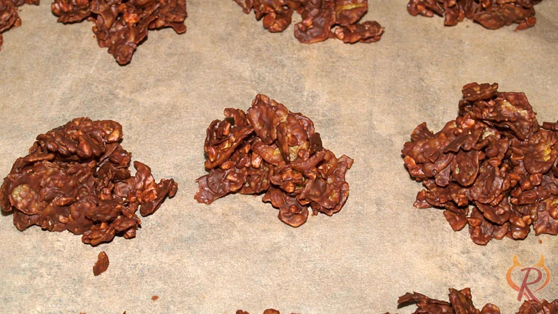 - Mit zwei Teelöffeln Häufchen von der Masse auf ein bis zwei Blätter Backpapier geben. Die Schoko Crossies stehen lassen, bis die Schokolade wieder fest geworden ist.