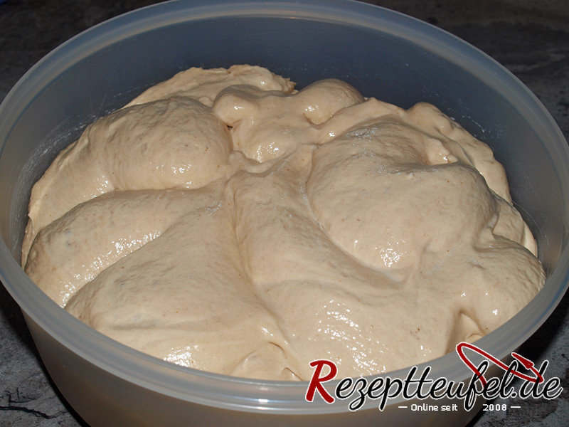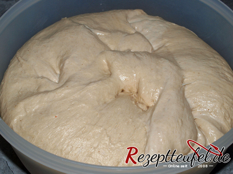 - Den Hefeteig ca. 90 Minuten bei Zimmertemperatur gehen lassen, während der Gehzeit 2 mal mit nassen Händen in den Teig greifen und ihn zusammenkneten.