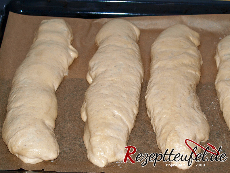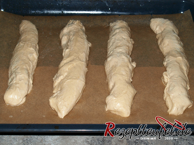 - Den Teig auf die Arbeitsplatte geben ohne nochmaliges durchkneten. Vom Teig werden jetzt mit einem Teigschaber nach und nach 12 längliche Stücke abgetrennt, jedes Teigstück auf ca. 20 cm langgezogen und auf ein mit Backpapier belegtes Backblech gesetzt.