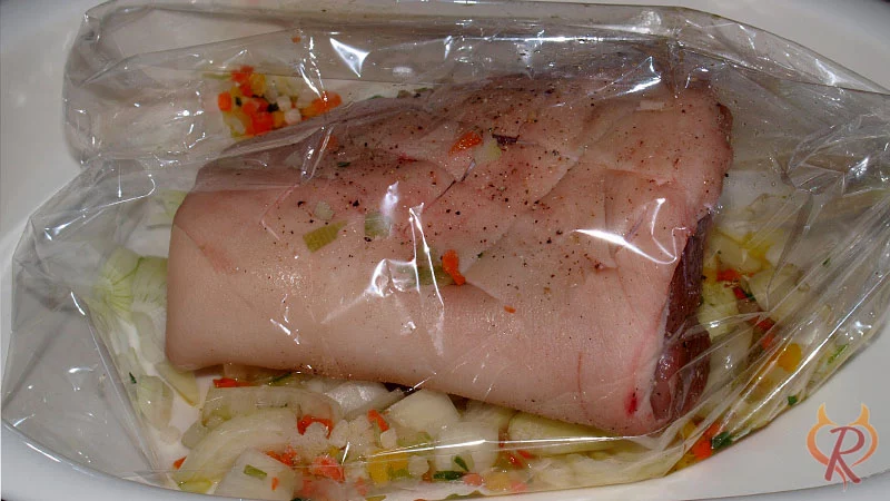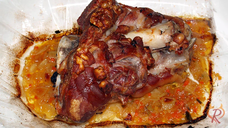 - Die gegarte Schweinshaxe im aufgeschnittenen Bratschlauch