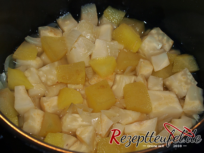 - Sellerie, Apfel und Schalotte in gesalzenem Wasser kochen