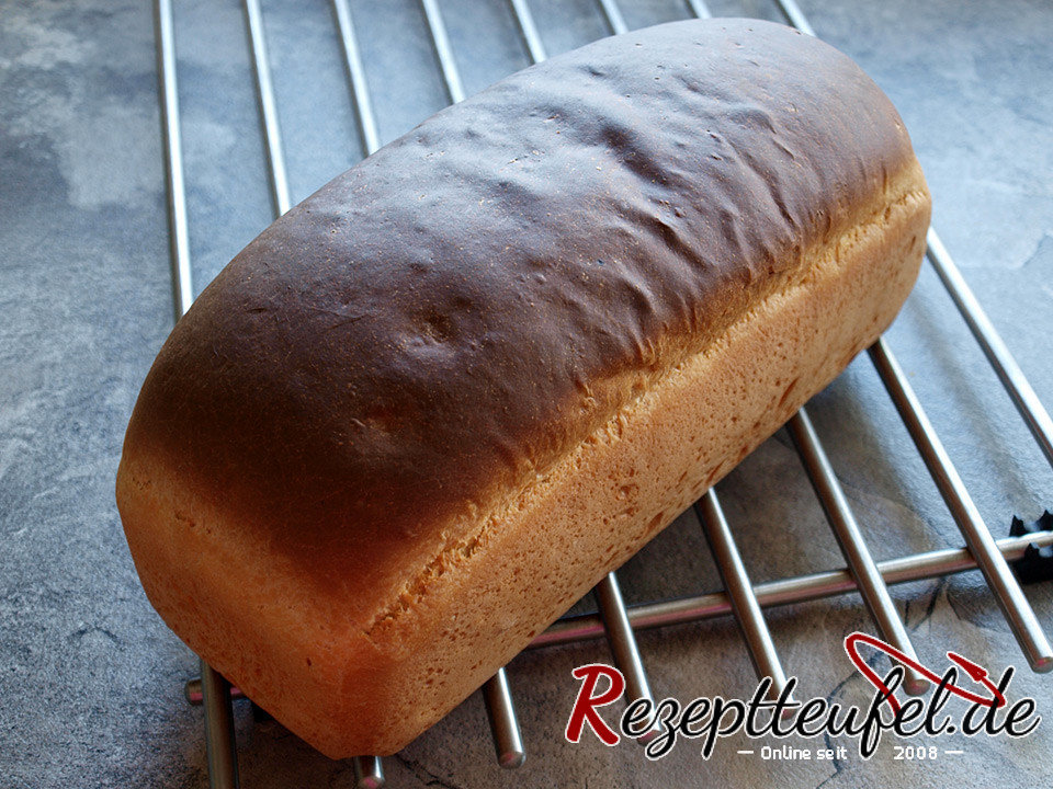 Das Toastbrot auf mittlerer Schiene in 40-50 Minuten goldbraun backen. Nach dem Backen aus der Kastenform stürzen und auf einem Gitterrost auskühlen lassen.