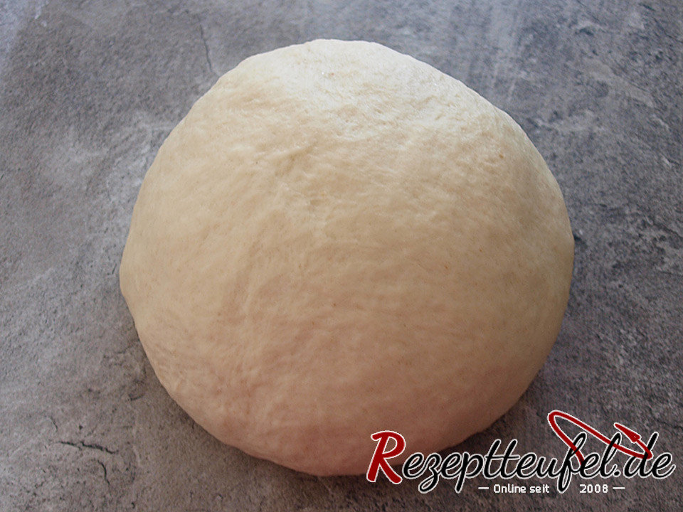 - Die restlichen Zutaten in eine Schüssel geben, die Hefemilch dazugeben und zu einem glatten Teig verkneten. Zugedeckt ca. 60 Minuten gehen lassen bis sich das Volumen verdoppelt hat.