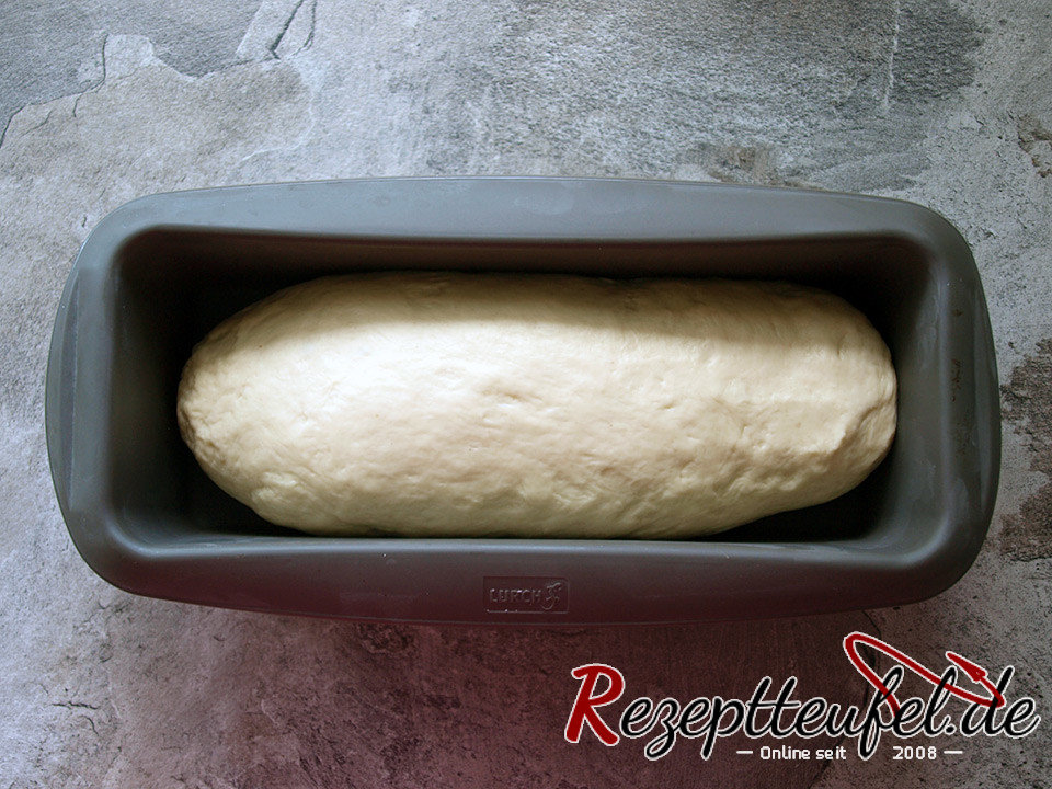 Den Teig durchkneten, zu einer Rolle in Länge der Kastenform formen und die Teigrolle in die Kastenform legen. Mit einem Tuch zugedeckt nochmals ca. 45 Minuten gehen lassen bis sich der Teig deutlich vergrößert hat. - Inzwischen den Backofen auf 220 °C Ober- Unterhitze vorheizen.