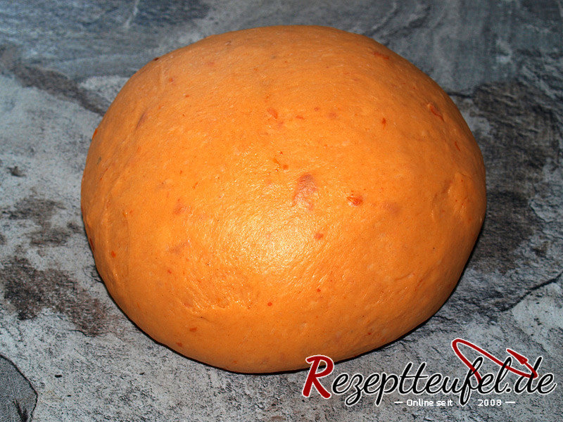 - Die Hefe in der Milch auflösen und mit den anderen Zutaten (außer den Tomaten!) zu einem weichen und elastischen Teig verkneten. Die Tomaten hinzufügen und unterkneten.