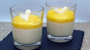 Vanillepudding mit Mango-Kokos-Spiegel gehört zu den Desserts, die rasch zubereitet sind. Der Vanillepudding wird selbstverständlich selbst gekocht und für den feineren Geschmack geben wir nicht nur Milch in den Pudding, sondern auch einen Anteil Sahne.