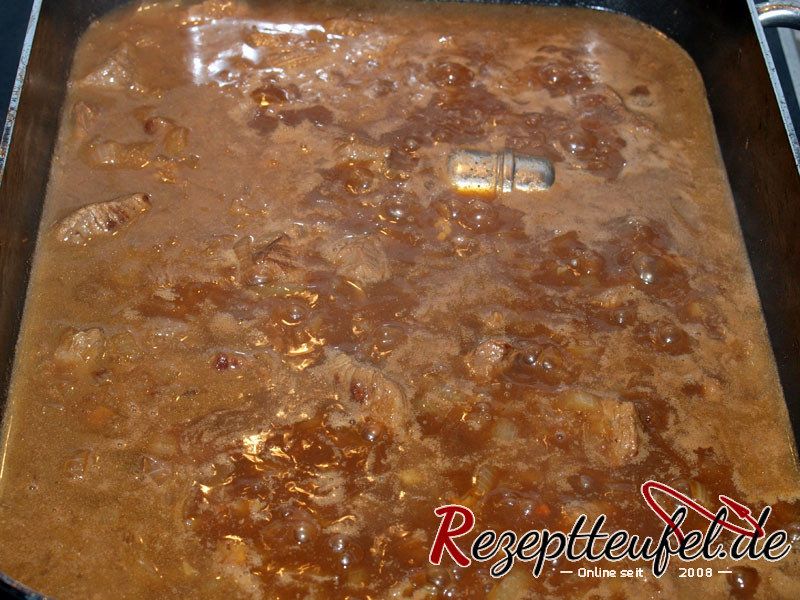 - Unter gelegentlichem Umrühren ca 1,5 bis 2 Stunden schmoren. Wenn das Fleisch weich ist, das Paniermehl zur Bindung hinzufügen, den grob gestoßenen Pfeffer hinzufügen und nochmals kurz aufkochen. Mit Salz und Zitronensaft abschmecken.50 g Paniermehl, 1 TL schwarze Pfefferkörner, - - Salz, 1 EL Zitronensaft