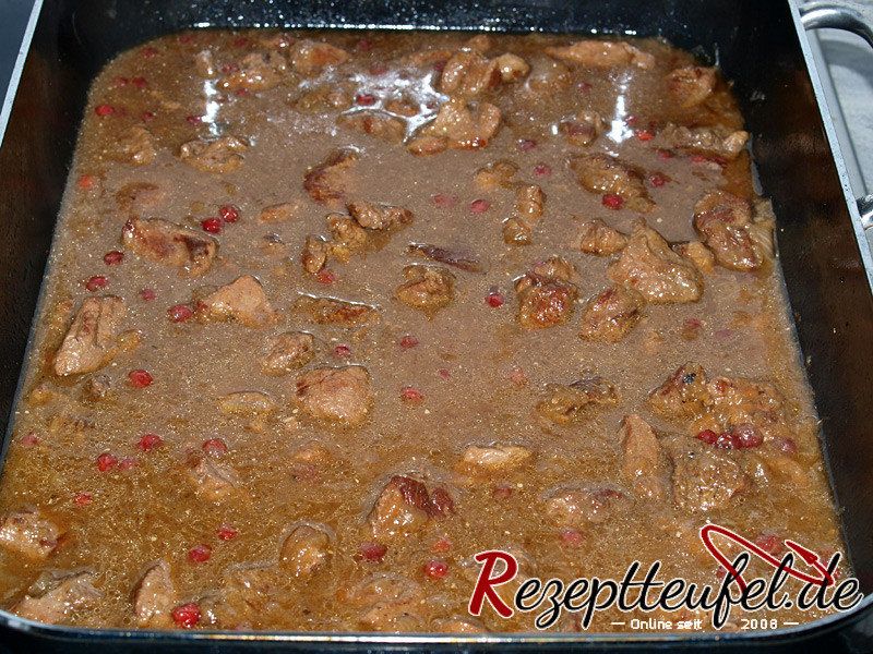 Dazu passen hervorragend die gemischten Knödel oder Semmelknödel, Rotkohl und die restlichen Preiselbeeren aus dem Glas.