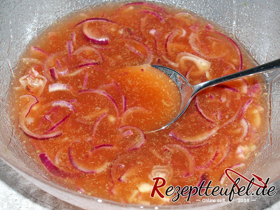 Die roten Zwiebeln werden in Ringe geschnitten und mit Brühe übergossen, somit verlieren die Zwiebeln ihre Schärfe. Und diese roten Zwiebeln waren scharf, ja, beim Schneiden sind mir prompt die Tränen in die Augen geschossen. Also musste der Überbrüh-Trick verwendet werden um die Zwiebeln zu entschärfen.
